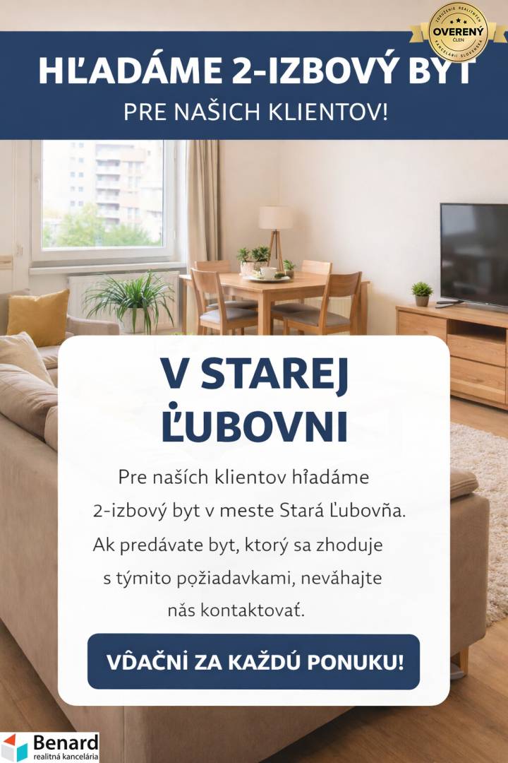Hľadáme pre klientov 2 izbový byt v Starej Ľubovni !