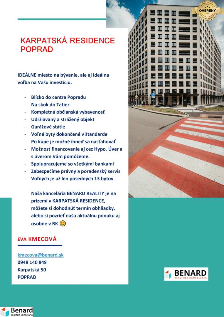 BENARD REALITY Vám ponúka na predaj posledné voľné byty v bytovom dome Karpatská residence :) Výborná lokalita s kompletnou občianskou vybavenosťou, blízko do centra Popradu, ale aj na ,, skok " do Tatier :) Karpatská residence je výborná voľba na vlastné bývanie, ale aj ako Vaša investícia. STAV BYTU: - Byty sú dokončené v ŠTANDARDE: - laminátové podlahy v celom byte, dlažba a keramické obklady so sanitou v kúpeľni a WC. - Kuchynská linka so vstavanými spotrebičmi: chladnička s mrazničkou, teplovzdušná rúra, indukčná varná doska, umývačka riadu, digestor vedený do komína, všetko v značke Whirlpool - PLASTOVÉ OKNÁ s izolačným trojsklom. V každej obytnej izbe je minimálne jedno okenné krídlo otváravo – sklopné. - VZDUCHOTECHNIKA v kúpeľniach a WC. V byte je navrhnuté vzduchotechnické potrubie pre napojenie digestora ŠATNÍK: nadštandardným prvkom je aj uzatvorenie šatníkového priestoru vo vstupnej chodbe bytu posuvnými dverami, ktoré sú zahrnuté v cene bytu. Vnútorné vybavenie šatníka si klient zabezpečuje individuálne v zmysle jeho predstáv. EXTÉRIEROVÉ ROLETY: exteriérové rolety s elektrickým ovládaním, s vonkajším zaomietacím bubnom, vo farbe okenných rámov. VYKUROVANIE: - Objekt má vlastnú plynovú kotolňu, z ktorej je centrálne distribuované teplo a TÚV do bytov a apartmánov. - V každom byte sú biele doskové panelové radiátory a v kúpeľni sú biele rebríkové radiátory - Regulácia tepla je umožnená termostatickými hlavicami na vykurovacích telesách - Merače tepla sú umiestnené v uzatváracích šachtách prístupných zo spoločnej chodby, pre každý byt je inštalované individuálne meranie spotreby. CHLADENIE: - V bytoch je zrealizovaná príprava na individuálne chladenie bytov pozostávajúca z priestoru na umiestnenie vonkajšej jednotky chladenia na balkóne, vývodu elektroinštalácie na pripojenie vonkajšej jednotky chladenia, podľa platnej projektovej dokumentácie. (Vonkajšie jednotky, vnútorné jednotky vrátane regulácie, inštalácie rozvodov chladiva a dopojenia elektriny a odvod kondenzátu v rámci bytu nie sú súčasťou štandardného vybavenia). PIVNICA: Možnosť zakúpenia pivničnej kobky. PARKOVANIE: Možnosť zakúpenia garážového státia v suteréne bytového domu. VÝŤAH: V celom bytovom dome sú 3 výťahy, dva osobné a jeden nákladný a všetky idú aj do suterénu bytového dumu. SPOLOČNÉ PRIESTORY: - Sú pravidelne udržiavané a upratané, tak ako vonkajšie aj vnútorné. - Vstup do bytového domu je cez hliníkové rámové presklené dvere s elektrozámkom ovládaným bezdotykovým čítacím zariadením. - Vo vstupnej hale je na podlahe čistiaca zóna a na stene poštové schránky. - Vstupná časť do bytového domu, výťahová lobby a spoločné chodby majú na podlahe dlažbu a na stenách náter bielej farby. - Bytové chodby majú inštalované svietidlá, detektory pohybu a núdzové osvetlenie. - Vonku pri objekte je zabezpečený separovaný zber s pravidelným vývozom - Do garáži a zadnej časti objektu je možný vstup len cez rampu OKOLIE BYTOVÉHO DOMU: V blízkom okolí je kompletná občianska vybavenosť SAD, ŽSR, MHD, obchodné a nákupné centrá, lekári, reštaurácie, centrum mesta. KONTAKT: Ak máte záujem o obhliadku, prípadne potrebujete viac informácii, kontaktujte nás na: kmecova@benard.sk, tel.č. 0948 140 849, alebo osobne v realitnom centre na Karpatskej 50. KARPATSKÁ RESIDENCE TYP BYTU 5 je voľný na: 1 poschodí ( byt č.: 1.05. ) - 275 400 EUR - Výmera 88,09 m2 s loggiou - Orientácia bytu je na J/Z 1 poschodí ( byt č.: 1.13. ) - 275 400 EUR 2 poschodí ( byt č.: 2.13. ) - 275 400 EUR 3 poschodí ( byt č.: 3.13. ) - 275 400 EUR - Výmera 88,08 m2 s veľkou loggiou - Orientácia bytu je na S/V KARPATSKÁ RESIDENCE TYP BYTU 6: 1 poschodí ( byt č.: 1.06. ) - 253.400 EUR 2 poschodí ( byt č.: 2.06. ) - 253.400 EUR - Výmera 73,27 m2 s malou loggiou - Orientácia bytu je na Západ KARPATSKÁ RESIDENCE APARTMÁN TYPU 10 a 12 je voľný: 1 poschodí ( byt č.: 1.12. ) - 247 900 EUR 2 poschodí ( byt č.: 2.12. ) - 247 900 EUR 3 poschodí ( byt č.: 3.12. ) - 247 900 EUR 4 poschodí ( byt č.: 4.12. ) - 247 900 EUR 5 poschodí ( byt č.: 5.12. ) - 247 900 EUR - Výmera 73,26 m2 s malou loggiou - Orientácia bytu je na Sever 6 poschodí ( byt č.: 6.10. ) - 247 900 EUR - Výmera 73,26 m2 s loggiou - Orientácia bytu je na Sever