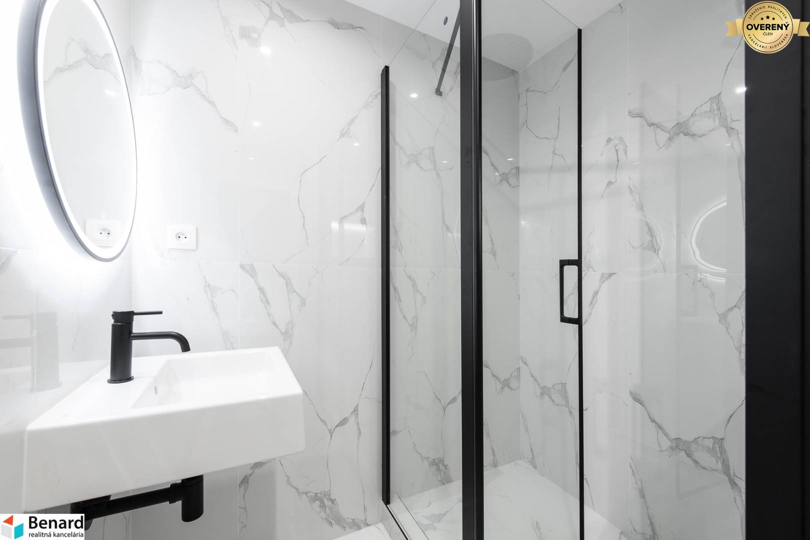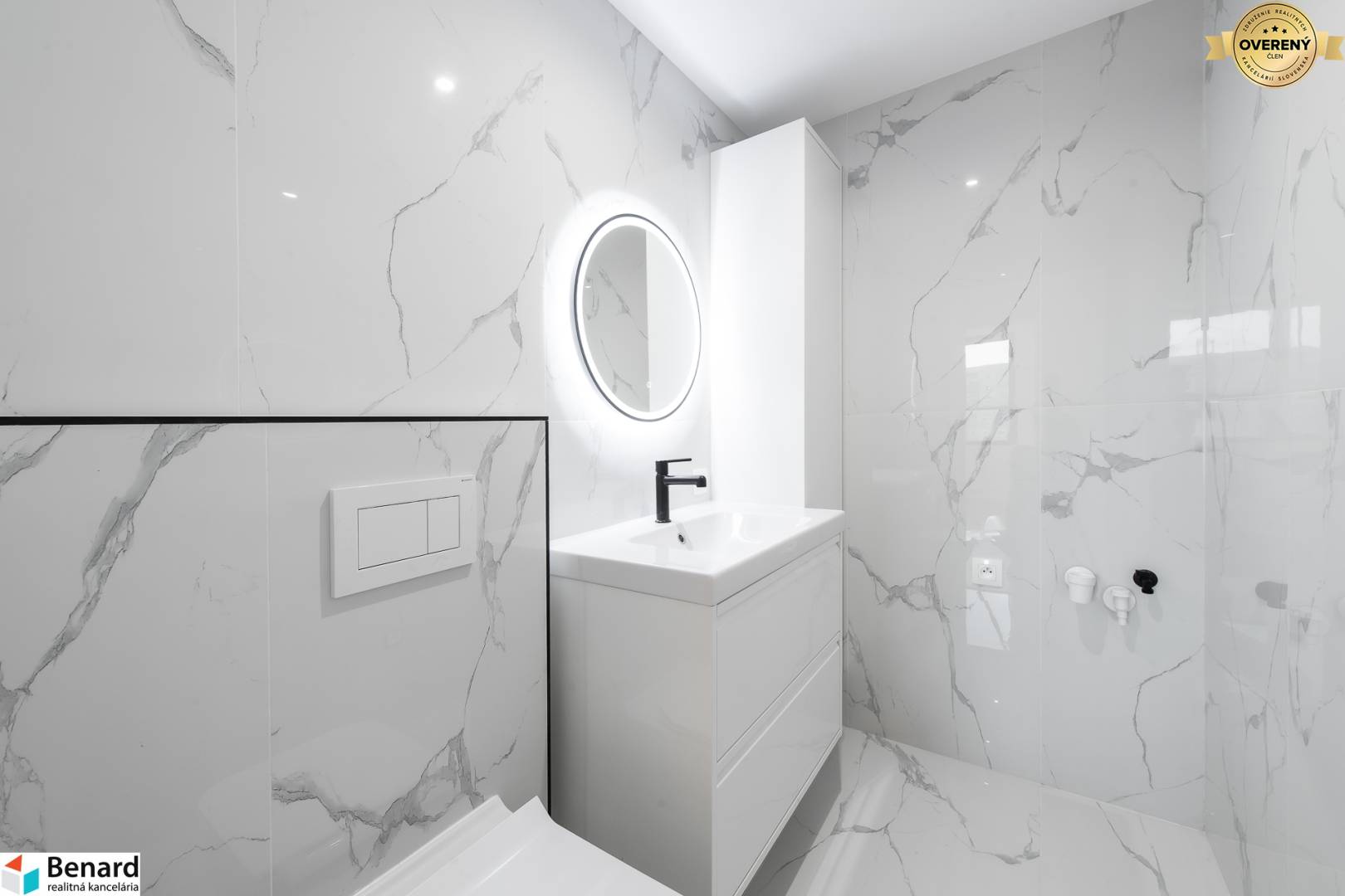 • Kúpeľňa & WC: Luxusný obklad Calacatta (600x1200 mm), sprchový kút s podomietkovou batériou, umývadlá Cube a štýlové čierne doplnky v kombinácii s podsvietenými zrkadlami.