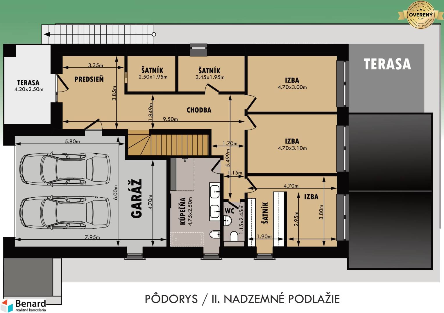 Súčasťou domu je komfortná garáž, ktorá poskytuje pohodlný vstup priamo do predsiene a zároveň chráni vaše vozidlá pred akýmkoľvek počasím. Je tu tiež predpríprava pre dobíjanie elektrického auta a do garáže môžete zaparkovať až dve vozidlá. Rodinný dom bol postavený v roku 2023 a je postavený z tehál Porotherm, čo zaručuje kvalitnú a pevnú konštrukciu s výbornými tepelnoizolačnými vlastnosťami. Zastavaná plocha prvého podlažie je 212,53 m² a úžitková plocha je 138,9 m². Zastavaná plocha druhého podlažia je 186,53 m² a úžitková plocha je 145,54 m². Dom disponuje terasou, ktorá je krytá a má 36,52 m². Pozemok má 642 m².