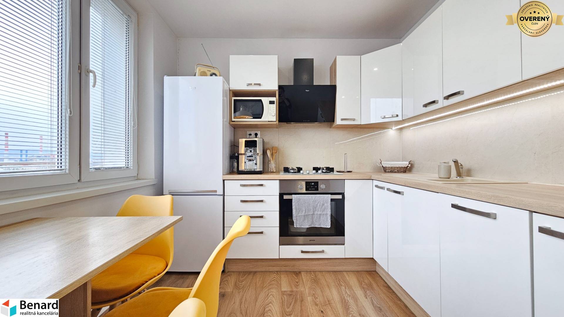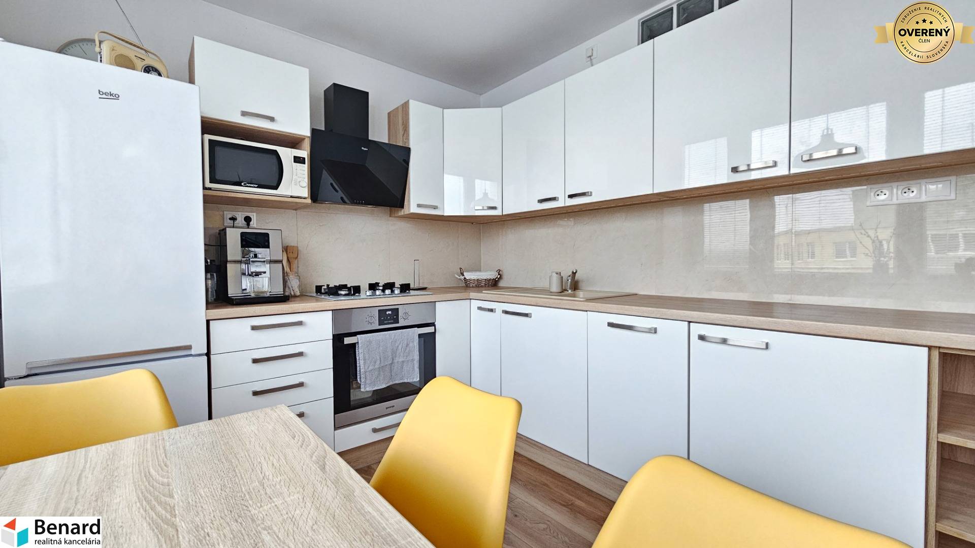 - byt je kompletne zariadený nábytkom, spotrebičmi (umývačka riadu, práčka so sušičkou), stačí si priniesť osobné veci a bývať,