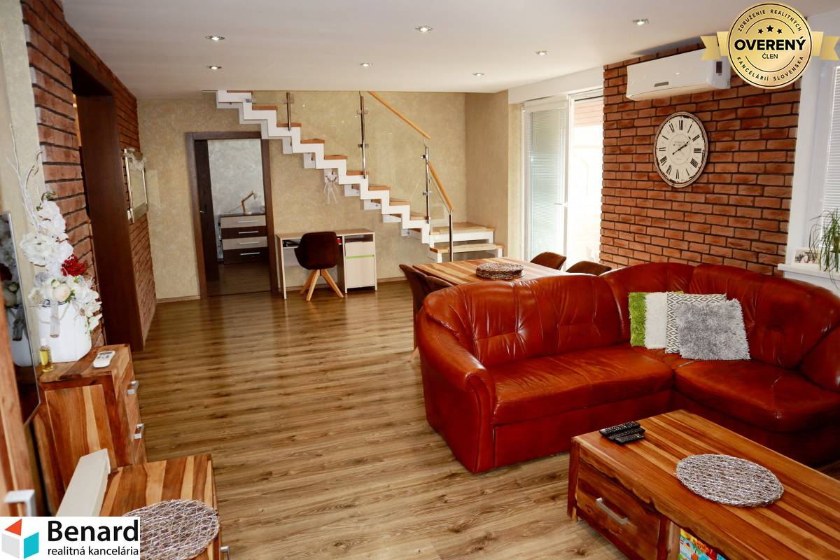 Na prenájom výnimočný, komplet zariadený 5 izbový mezonetový byt, ktorý sa nachádza v blízkosti centra, ulica Komenského, Prešov. Pozostáva : prvé poschodie: vstupná chodba, otvorená kuchyňa, obývacia miestnosť, spálňa, kúpeľňa, samostatné wc, balkón druhé poschodie: 3 x izba, kúpeľňa s wc, šatník, chodba - 130 m2+ 12,84 loggia, 2 poschodie - byt v osobnom vlastníctve - novostavba - plastové okná, strešné okná na poschodí, v obývacej miestnosti francúzske okno – odťahujúce, žalúzie, a interiérové rolety - keramická dlažba ( kúpeľne, časť chodba, wc, balkón), laminátová plávajúca kvalitná podlaha v izbách, kuchyňa, chodba - obklad ( kúpeľne, kuchyňa) - kuchynská linka, spolu so vstavanými spotrebičmi (umývačka riadu, plynový sporák, mikrovlnka, elektrická rúra, digestor, chladnička s mrazničkou) v kuchynskej linke nájdete základnú kuchynskú výbavu: taniere , hrnce, príbor, poháre, kávovar - vstupná chodba ( vstavaná skriňa) - obývacia izba (jedálenský stôl + stoličky, sedacia súprava, konferenčný stolík, komoda pod televízor, skrinky, televízor) - spálňa (manželská posteľ + matrace, vstavaná skriňa) - kúpeľňa na prízemí (vaňa, sprchovací nábytok, práčka, sušička, kúpeľňový nábytok) - izba na poschodí 1 ( písací stolík, skriňa, skrinky, komoda, veľké kreslo) - izba na poschodí 2 ( vstavaná skriňa, posteľ, písací stolík, stolička, knihovnička, komoda) - izba na poschodí 3 ( vstavaná skriňa, posteľ, písací stolík, knihovnička, komoda ) - kúpeľňa 2 ( kúpeľňový nábytok, sprchovací kút, wc) - samostatný šatník ( police) - balkón: 2x kreslo + stolík - v obývacej izbe a izbách v podkroví klimatizáca - vlastné kúrenie ( plynový kotol) - v cene je zahrnutý predplatený internet a TV programy - bez výťahu - k dispozícii je aj pivnica - parkovanie pri bytovom dome Cena nájmu je 1299,-€ vrátane energií+ v cene je zahrnutý predplatený internet a TV programy. Dvojmesačný depozit. Tento byt môžem len odporúčať !!! BYT SA PRENAJÍMA KOMPLET ZARIADENÝ, tak ako vidíte na fotkách! Výhoda bytu: veľmi dobrá lokalita, dostatok zelene, rýchlo sa dostanete do centra mesta aj peši, v tesnej blízkosti potraviny MILK-AGRO, blízkosti MŠ, ZŠ, športoviská... . Ak máte záujem o obhliadku, prípadne potrebujete viac informácii, nájdete nás v realitnom centre na Slovenskej ulici č. 8 v Prešove, alebo na benard@stonline.sk, tel.č: 0908 111 710