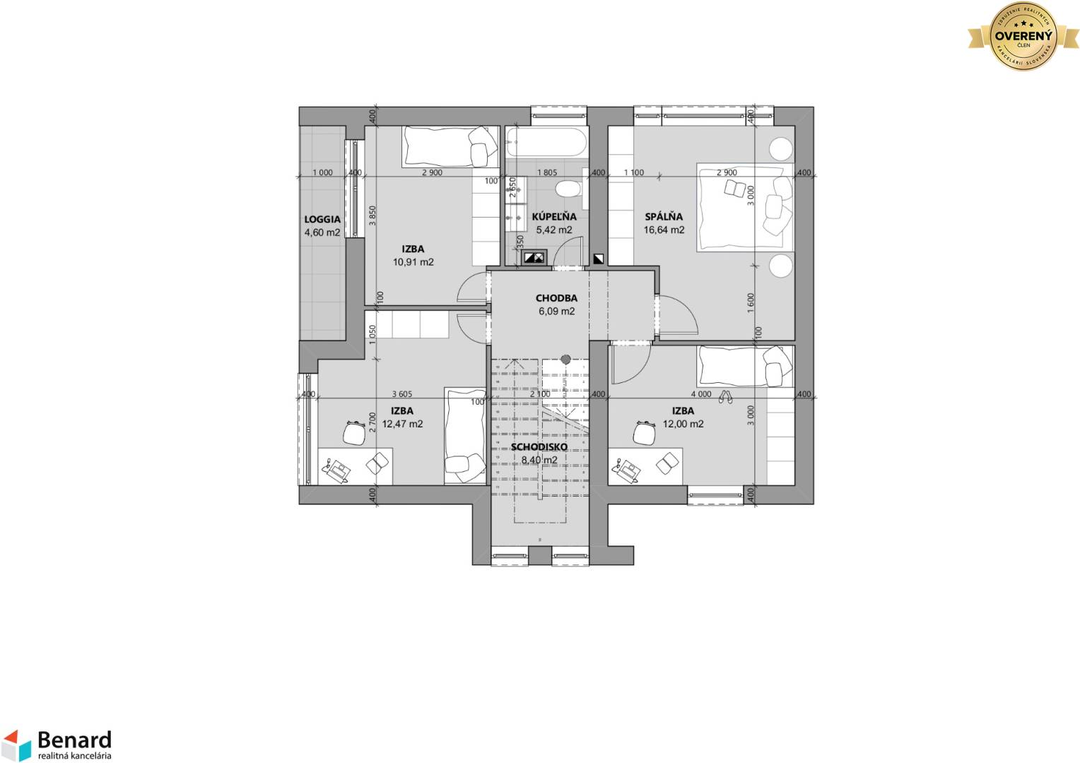 - na 2. obytnom podlaží je chodba, 4x izba, kúpeľňa s WC a schodiskom na povalu s celkovou rozlohou 70m2;