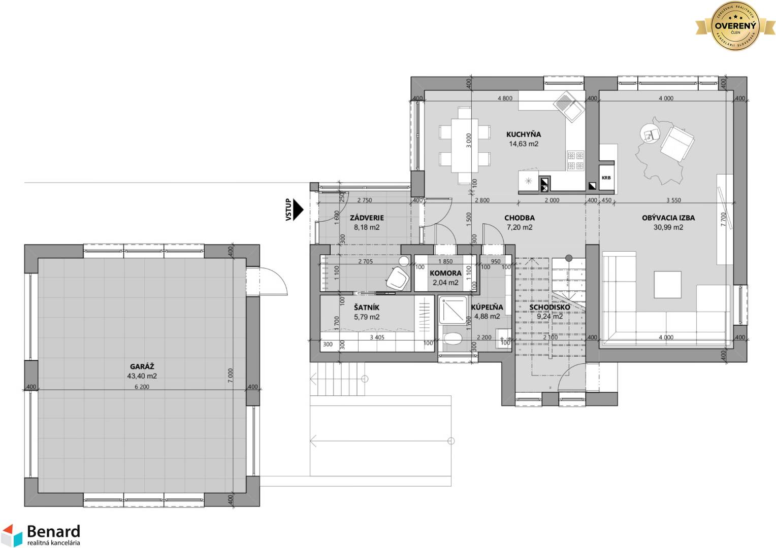 - garáž pre 2-3 auta s úložnými možnosťami o rozlohe 45m2; elektronický ovládané dvere;