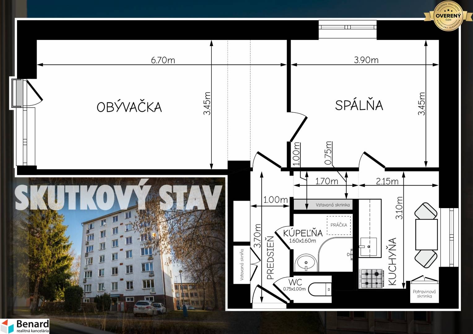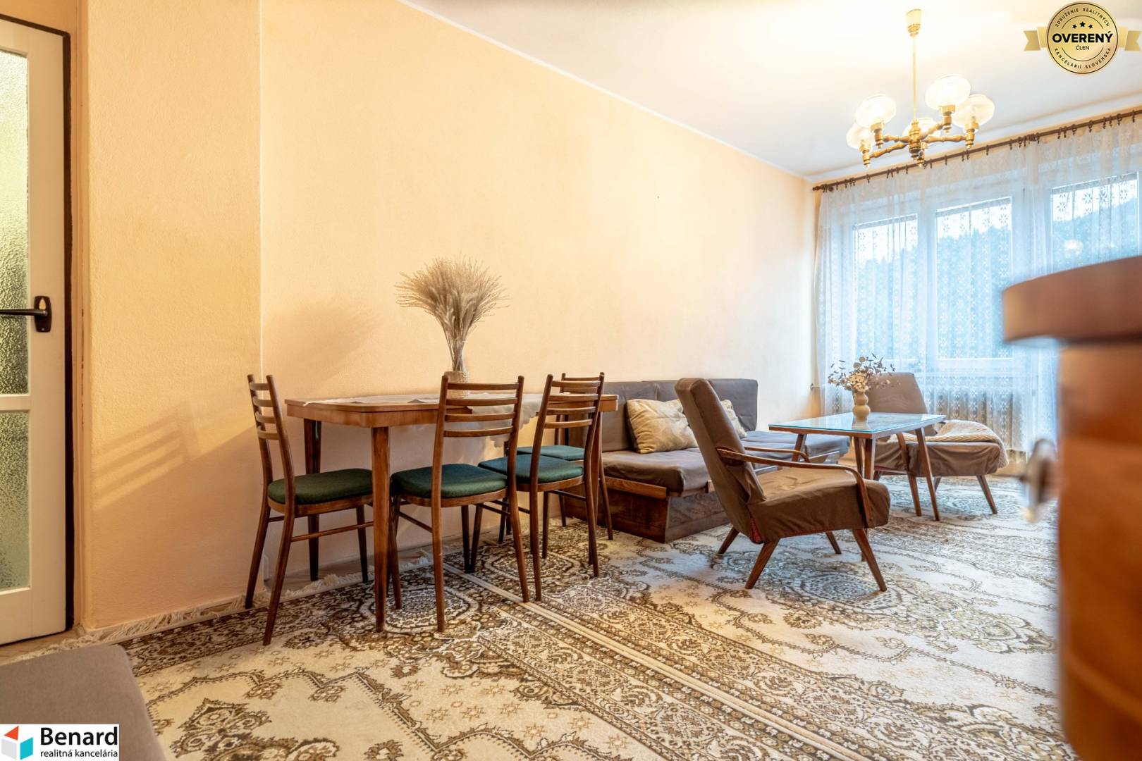 Dispozícia bytu je praktická a dobre riešená. Celková úžitková plocha je 51,16 m². Nehnuteľnosť je v pôvodnom stave, čo predstavuje ideálnu príležitosť pre nového majiteľa prispôsobiť si bývanie podľa vlastného vkusu bez kompromisov. Výhodou je, že byt už má plastové okná a murované jadro, ktoré bolo rekonštruované približne pred 10 rokmi. K dispozícii je aj pivnica a v bytovom dome je výťah.