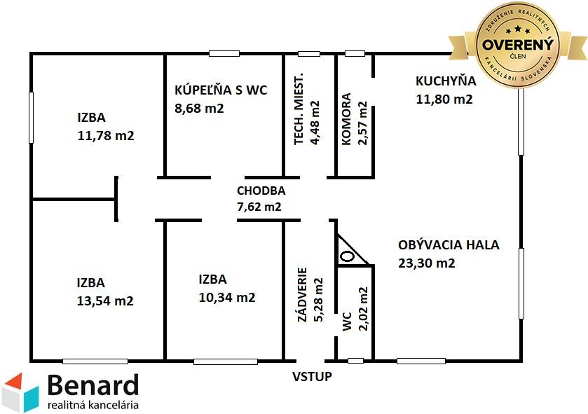 RD pozostáva: zádverie (5,28 m2), chodba(7,62 m2), WC(2,02 m2), komora (2,57 m2), kuchyňa (11,80 m2) obývacia hala (23,30 m2), izba(10,34 m2), izba (13,54 m2), izba (11,78 m2) kúpeľňa s WC (8,68 m2), technická miestnosť (4,48 m2)