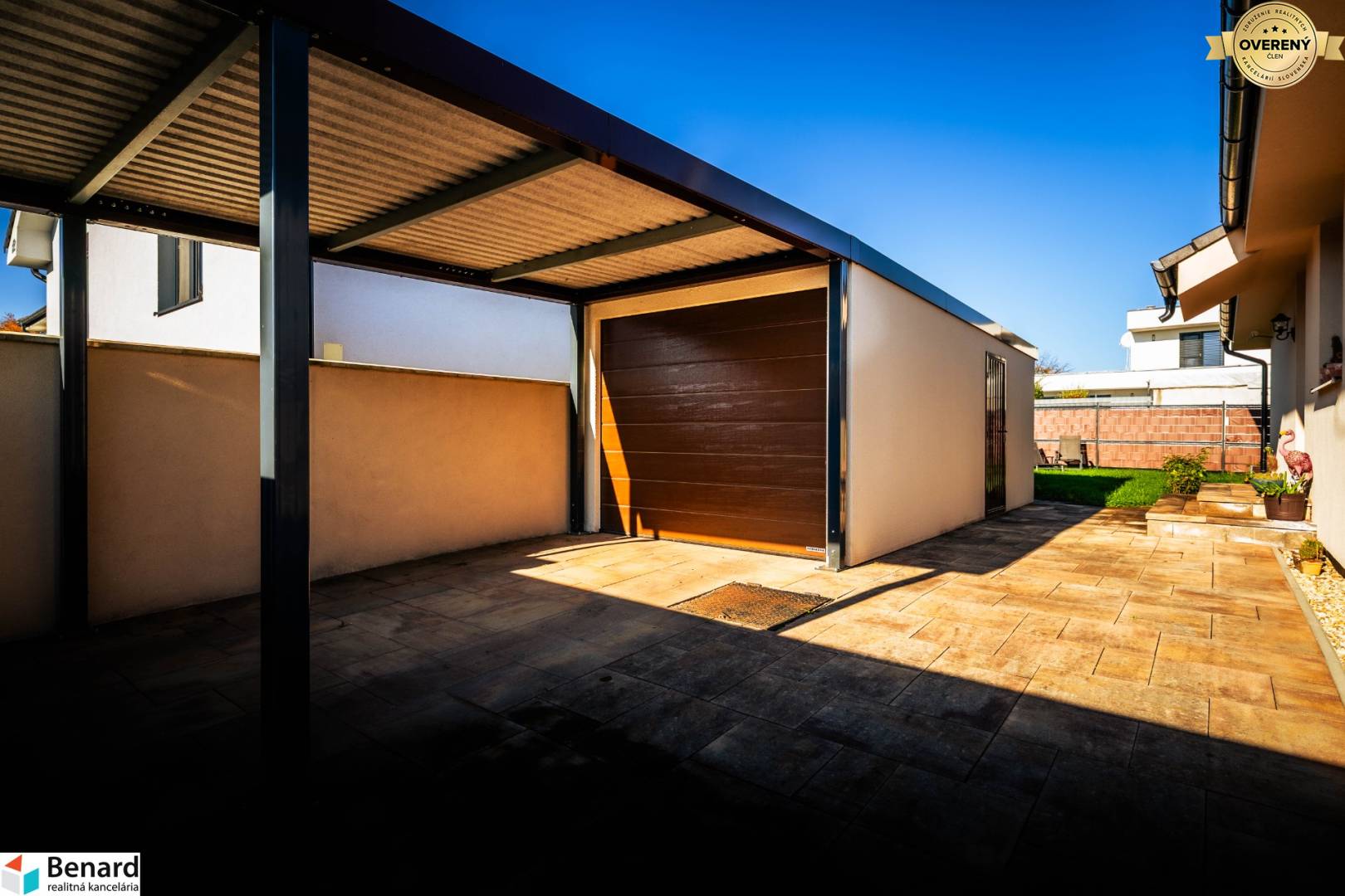 Na pozemku sa nachádza montovaná garáž s elektrickou prípojkou, pred ktorou je prístrešok pre ďalšie auto. Veľkosť pozemku je 343 m². Dom je vybavený kamerovým systémom, plastovými oknami s trojsklom a podlahovým kúrením, ktoré v kúpeľni dopĺňa radiátor.