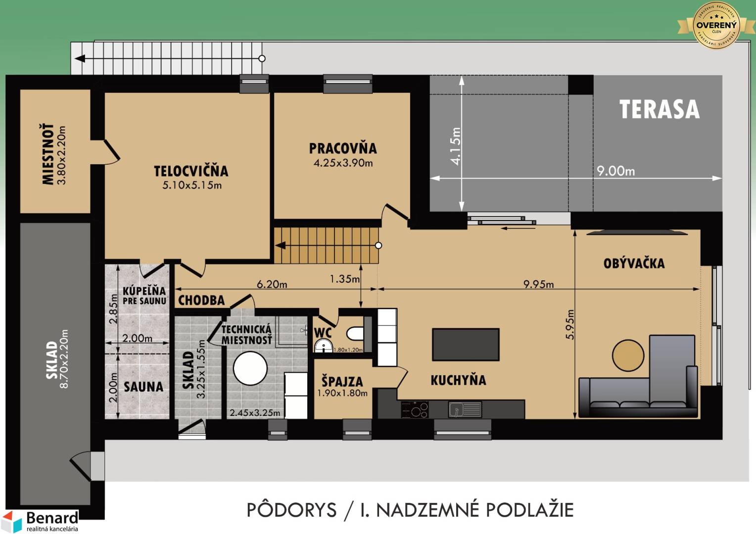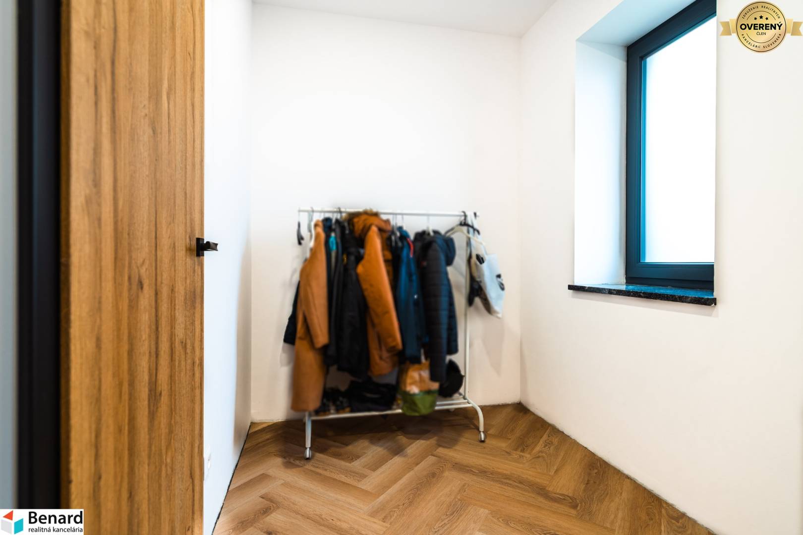 Na prvom podlaží vás privíta priestranná obývacia izba prepojená s jedálňou a kuchyňou so špajzou, ktorá je stvorená pre spoločné chvíle s rodinou. Špajza je vetrateľná, nakoľko má okno. V kuchyni boli použité spotrebiče značky Gorenje a nachádza sa tu filter pre úpravu vody. Nechýba pracovňa, miestnosť určená na šport či oddych, predpríprava pre saunu s vlastnou kúpeľňou, technická miestnosť, ktorá je vybavená aj práčovňou a sprchovým kútom, toaleta, pivnica a praktické sklady. Druhé podlažie ponúka hlavnú spálňu s priestranným šatníkom a panoramatickým výhľadom na majestátne Tatry, dve izby so spoločným šatníkom na chodbe, ktoré vytvárajú útulné zázemie pre deti či hostí. Nájdete tu tiež krásnu kúpeľňu, toaletu a predsieň s ďalším šatníkom.