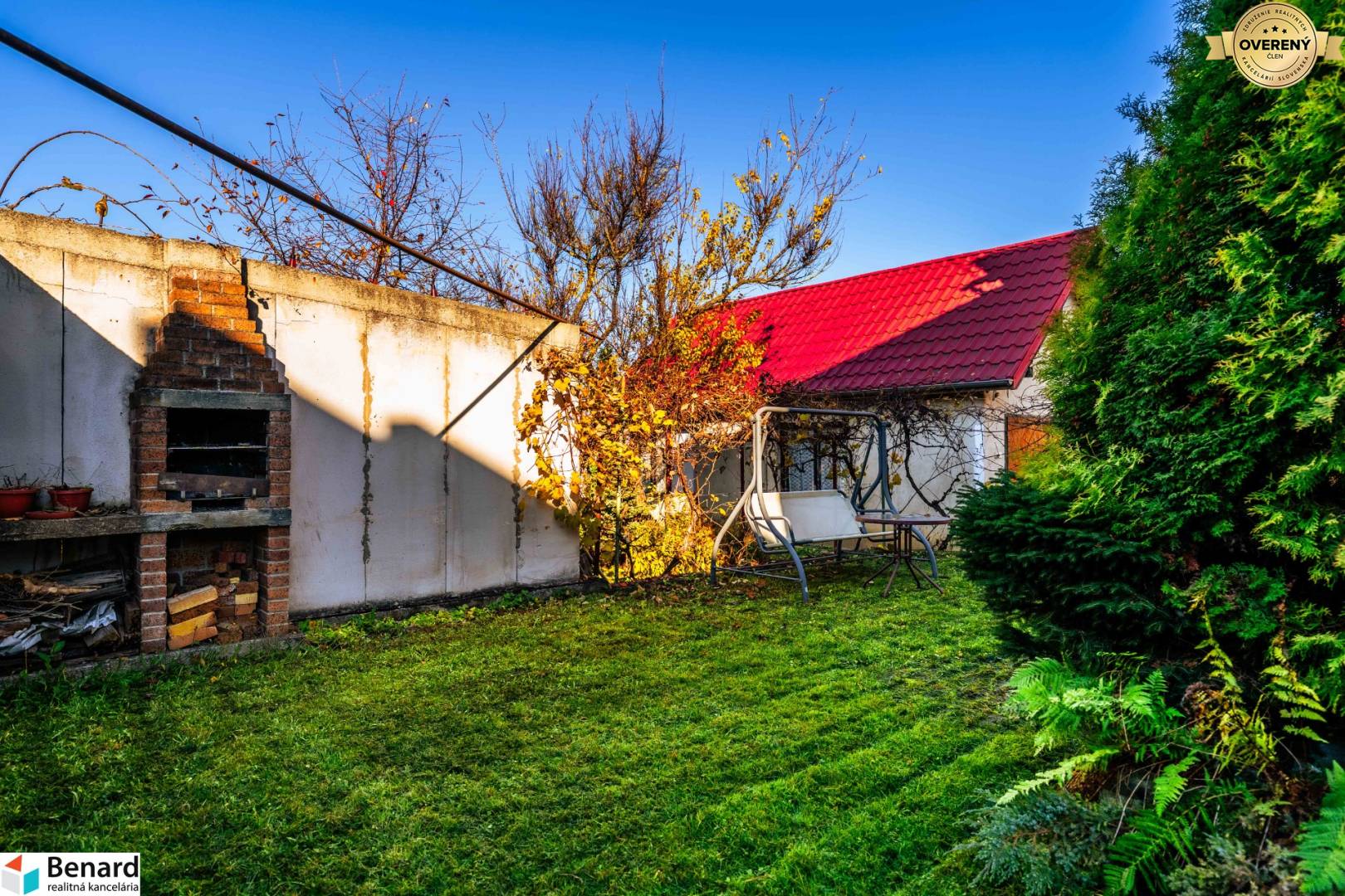 Pozemok má rozlohu 730 m² a nachádza sa na ňom aj samostatná garáž. Záhrada je bohatá na ovocné stromy – rastú tu kivi, hruška, jabloň, broskyňa, banánovník, muchovník, višňa, hrozno, slivka a ďalšie. Za domom je útulné posedenie s vonkajším krbom, ideálne na relax či rodinné oslavy a pred domom je pekná predzáhradka.