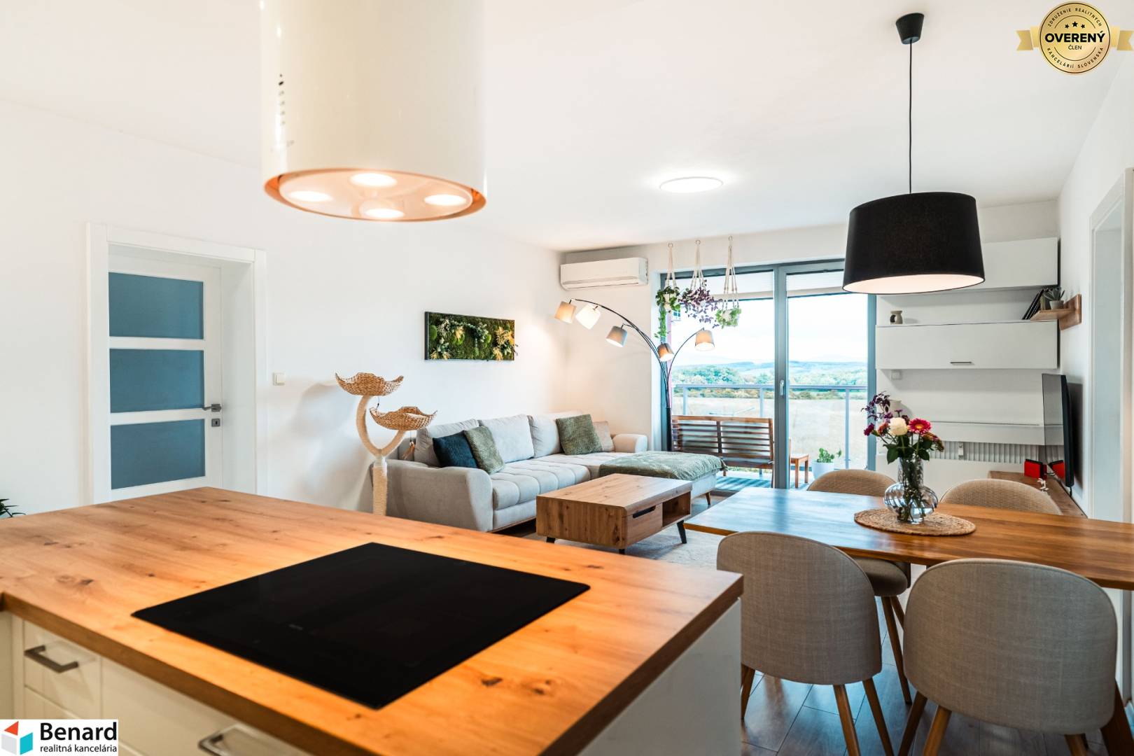 Hľadáte priestranný a moderný byt už v skolaudovanej novostavbe, ktorý je zariadený? Máme pre Vás na predaj 4-izbový byt v novostavbe s parkovacím miestom. Byt sa nachádza na Jelšovej ulici, v obľúbenom projekte Panoráma. Ak si potrpíte na prostredie, v ktorom žijete a túžite po čerstvom vzduchu, či výhľade na lúky a lesy, tak Panoráma je pre vás ideálnou voľbou. Okolitá príroda a les ponúkajú pestré možnosti oddychu a rekreácie. Nájdete tu materskú školu, ohradený areál, kde sú detské ihriská, krásne a záhradníkom udržiavané pozemky, aj zastávku MHD. Rodičia určite ocenia, že za bytovými domami sa nachádza 250 metrov dlhý a oplotený dvor, kde sa môžu ich deti bezpečne hrať. Jednoducho všetko, čo potrebujete pre pohodlný, každodenný život. Táto lokalita je ideálnym miestom pre rodiny a pre komunitný život. Bytový dom je postavený z tehly a je zateplený prírodným materiálom, s 15-centimetrovou minerálnou vlnou. V bytovke sú štyri poschodia a predávaná nehnuteľnosť sa nachádza na 3. p. Byt je priestranný a má skvelé rozloženie. Spálňa, detská izba a pracovňa majú samostatné vstupy, sú nepriechodné. Kupujúci určite ocenia, že v byte sú dve toalety a dva samostatné balkóny, na ktoré sa dostanete z obývačky a zo spálne. Môžete si tak vychutnávať výhľady na okolitú prírodu. V dennej časti sa nachádza spojená obývačka s kuchyňou, kde je klimatizácia. V byte sú kvalitné okná s trojsklom. V bytovke sa nachádza plynová kotolňa, ktorá slúži na vykurovanie a ohrev úžitkovej vody, preto sú tu nízke mesačné náklady. Výhodou je, že k dispozícii je komora, ktorá sa nachádza oproti bytu a tiež pivnica, ktorá je na prízemí. Kupujúci má možnosť si zakúpiť k bytu parkovacie miesto, ktoré je hneď pri bytovom dome. Má tak možnosť istoty, že vždy zaparkuje a komfort, ktorý so sebou takéto vlastníctvo prináša. Cena parkovacieho miesta je 10.000 eur. Výhody Vášho budúceho domova sú: - nízke mesačné náklady, - byt je priestranný, - byt má dva balkóny s krásnym výhľadom, - k dispozícii je komora, ktorá sa nachádza oproti bytu a tiež pivnica, ktorá je na prízemí bytového domu, - tiché bývanie s množstvom zelene, - možnosť zakúpiť si parkovacie miesto, ktoré je hneď pri bytovom dome, - celková plocha bytu je 102 m2 a plocha obytných miestností je 92,43 m2, - príďte sa o týchto, a aj iných výhodách presvedčiť sami a rezervujte si obhliadku na čísle 0903 367 922.