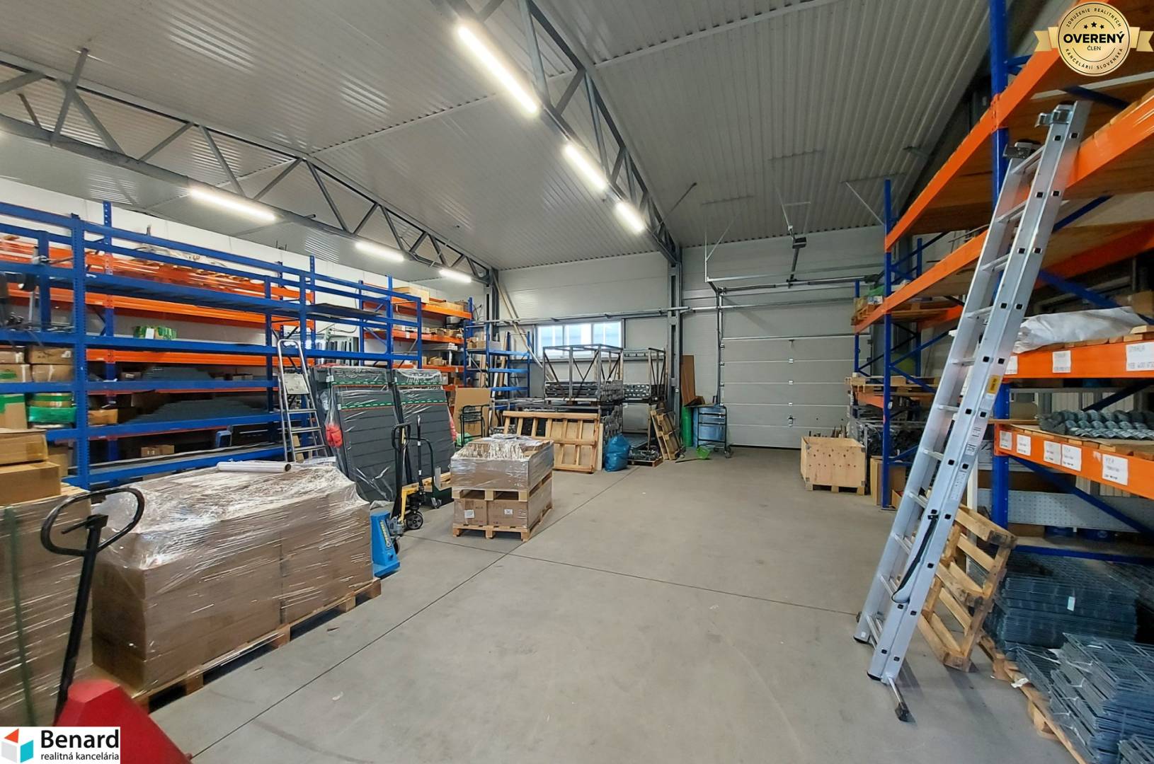 Skladová časť: Priestranná hala s čistou minimálnou výškou stropu 440 cm, vhodná pre regálové systémy.