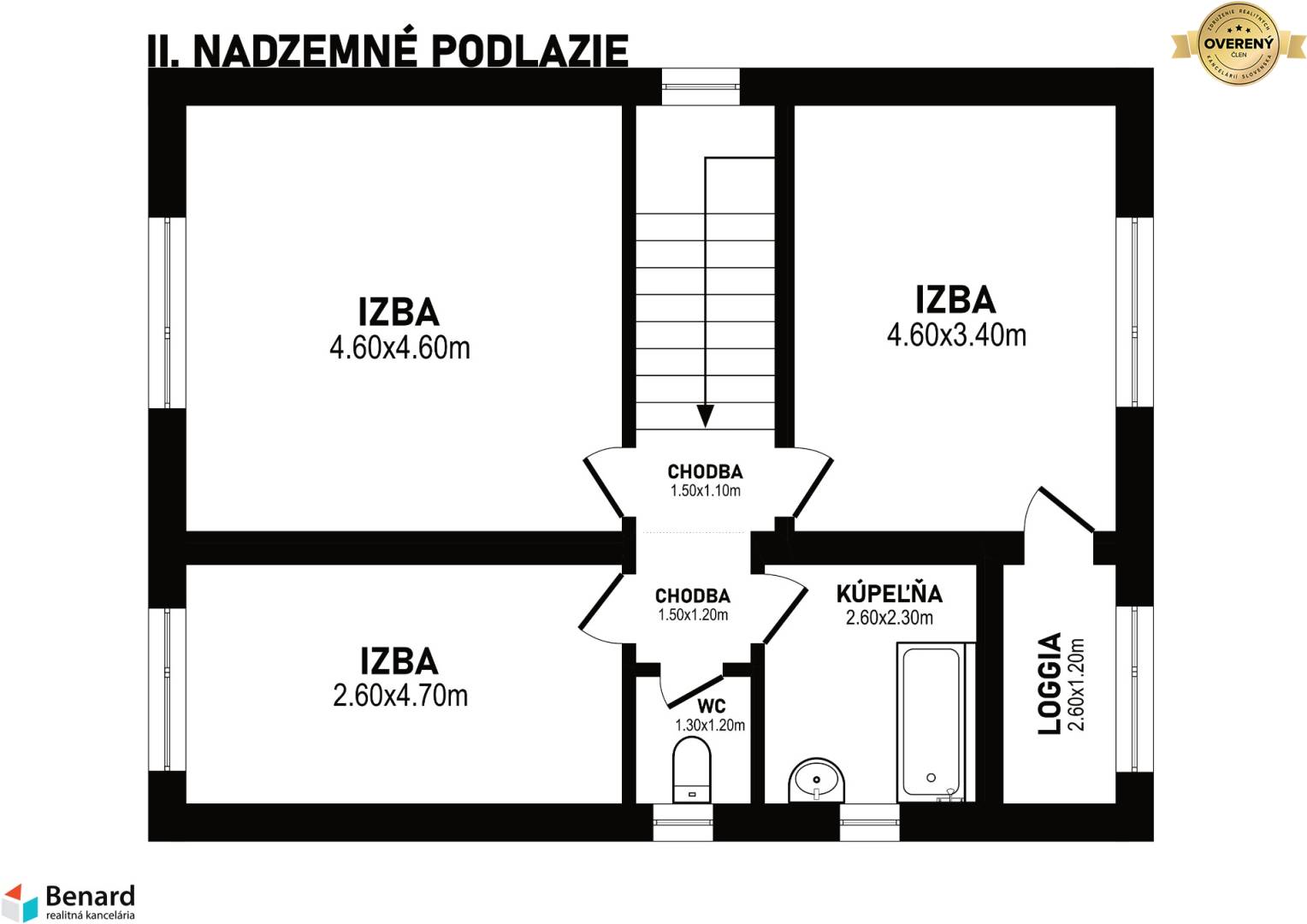 - Poschodie – chodba vedúca do troch nepriechodných izieb, pričom dve sú orientované na západnú stranu a tretia izba s loggiou na východ, ideálna na ranné slnečné lúče. Na podlaží je druhá kúpeľňa a samostatná toaleta.