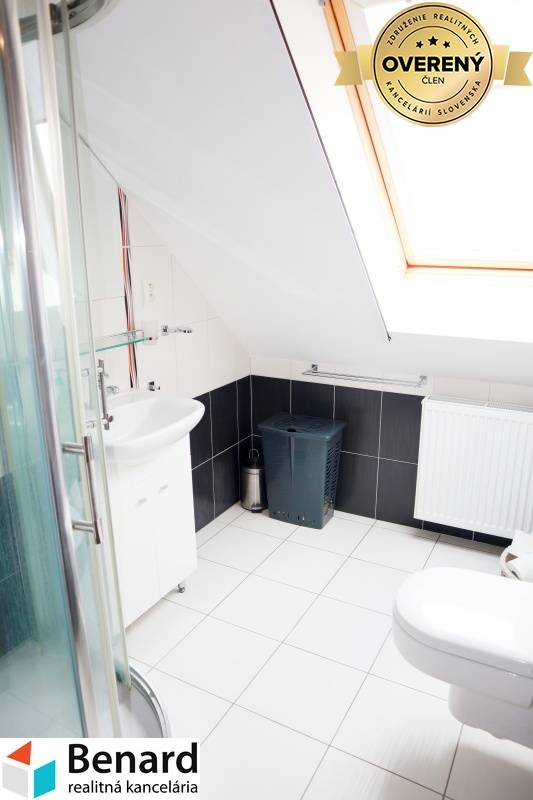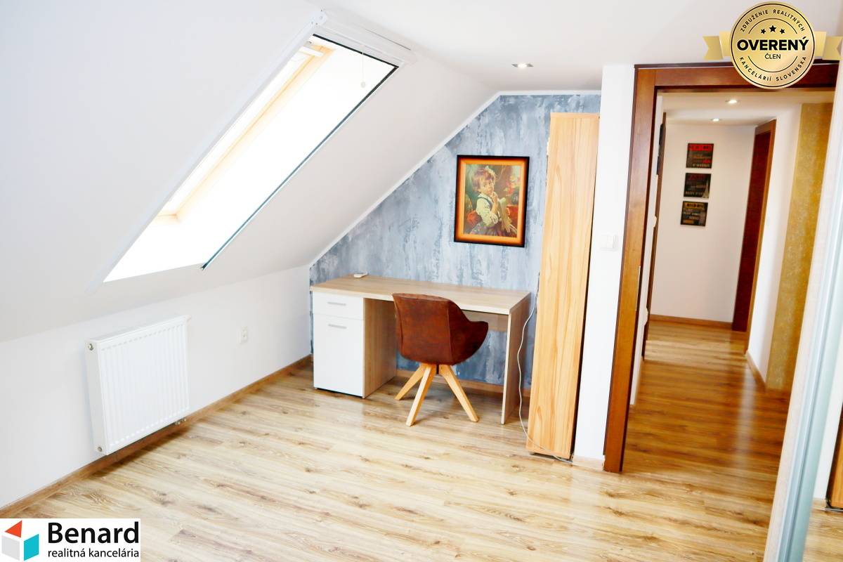 Na prenájom výnimočný, komplet zariadený 5 izbový mezonetový byt, ktorý sa nachádza v blízkosti centra, ulica Komenského, Prešov. Pozostáva : prvé poschodie: vstupná chodba, otvorená kuchyňa, obývacia miestnosť, spálňa, kúpeľňa, samostatné wc, balkón druhé poschodie: 3 x izba, kúpeľňa s wc, šatník, chodba - 130 m2+ 12,84 loggia, 2 poschodie - byt v osobnom vlastníctve - novostavba - plastové okná, strešné okná na poschodí, v obývacej miestnosti francúzske okno – odťahujúce, žalúzie, a interiérové rolety - keramická dlažba ( kúpeľne, časť chodba, wc, balkón), laminátová plávajúca kvalitná podlaha v izbách, kuchyňa, chodba - obklad ( kúpeľne, kuchyňa) - kuchynská linka, spolu so vstavanými spotrebičmi (umývačka riadu, plynový sporák, mikrovlnka, elektrická rúra, digestor, chladnička s mrazničkou) v kuchynskej linke nájdete základnú kuchynskú výbavu: taniere , hrnce, príbor, poháre, kávovar - vstupná chodba ( vstavaná skriňa) - obývacia izba (jedálenský stôl + stoličky, sedacia súprava, konferenčný stolík, komoda pod televízor, skrinky, televízor) - spálňa (manželská posteľ + matrace, vstavaná skriňa) - kúpeľňa na prízemí (vaňa, sprchovací nábytok, práčka, sušička, kúpeľňový nábytok) - izba na poschodí 1 ( písací stolík, skriňa, skrinky, komoda, veľké kreslo) - izba na poschodí 2 ( vstavaná skriňa, posteľ, písací stolík, stolička, knihovnička, komoda) - izba na poschodí 3 ( vstavaná skriňa, posteľ, písací stolík, knihovnička, komoda ) - kúpeľňa 2 ( kúpeľňový nábytok, sprchovací kút, wc) - samostatný šatník ( police) - balkón: 2x kreslo + stolík - v obývacej izbe a izbách v podkroví klimatizáca - vlastné kúrenie ( plynový kotol) - v cene je zahrnutý predplatený internet a TV programy - bez výťahu - k dispozícii je aj pivnica - parkovanie pri bytovom dome Cena nájmu je 1399,-€ vrátane energií+ v cene je zahrnutý predplatený internet a TV programy. Dvojmesačný depozit. Tento byt môžem len odporúčať !!! BYT SA PRENAJÍMA KOMPLET ZARIADENÝ, tak ako vidíte na fotkách! Výhoda bytu: veľmi dobrá lokalita, dostatok zelene, rýchlo sa dostanete do centra mesta aj peši, v tesnej blízkosti potraviny MILK-AGRO, blízkosti MŠ, ZŠ, športoviská... . Ak máte záujem o obhliadku, prípadne potrebujete viac informácii, nájdete nás v realitnom centre na Slovenskej ulici č. 8 v Prešove, alebo na benard@stonline.sk, tel.č: 0908 111 710