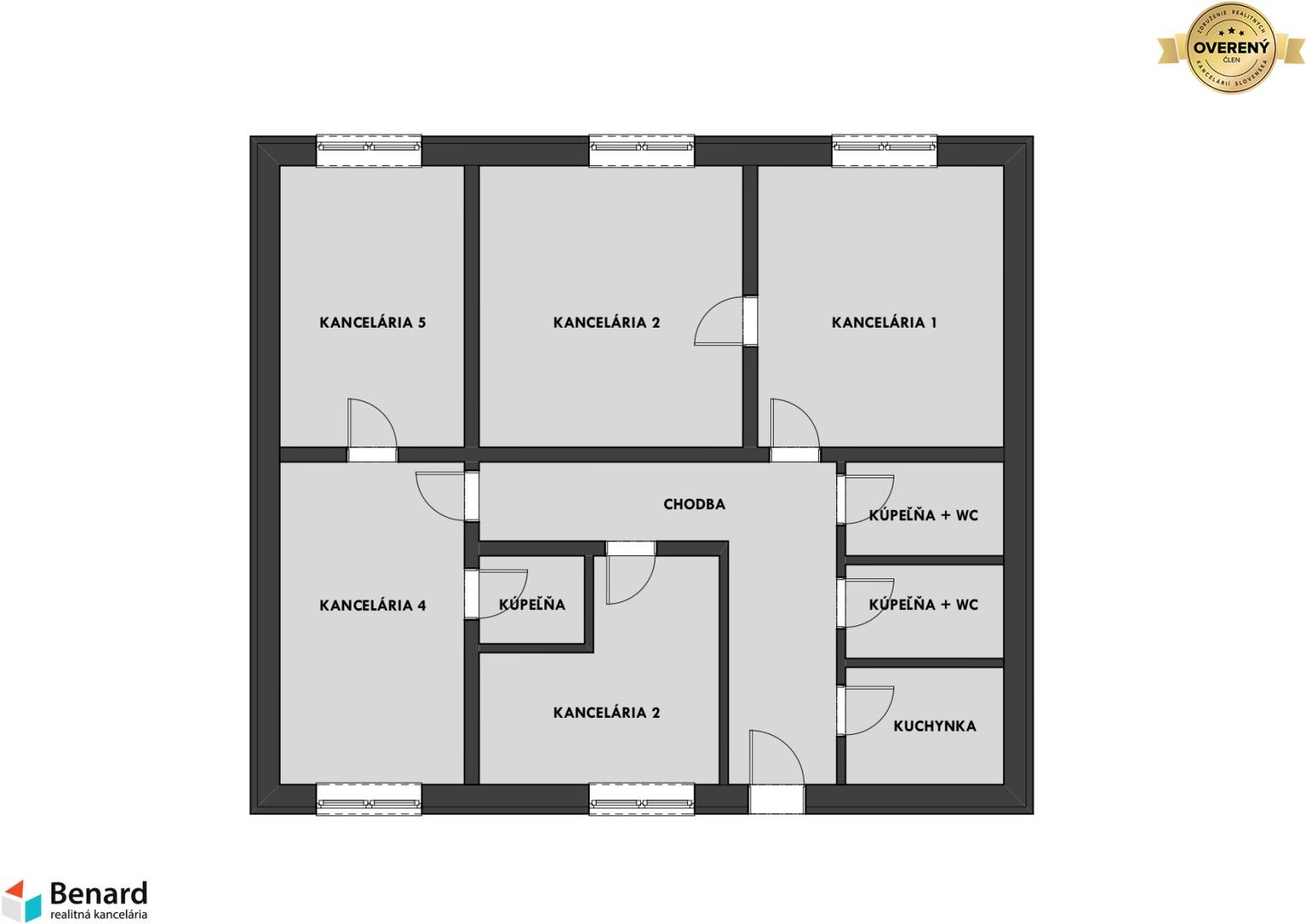 - v priestoroch sa nachádzajú 5 kancelárii (15-22m2), kuchynka, 3x kúpeľňa, 2x WC, chodba;