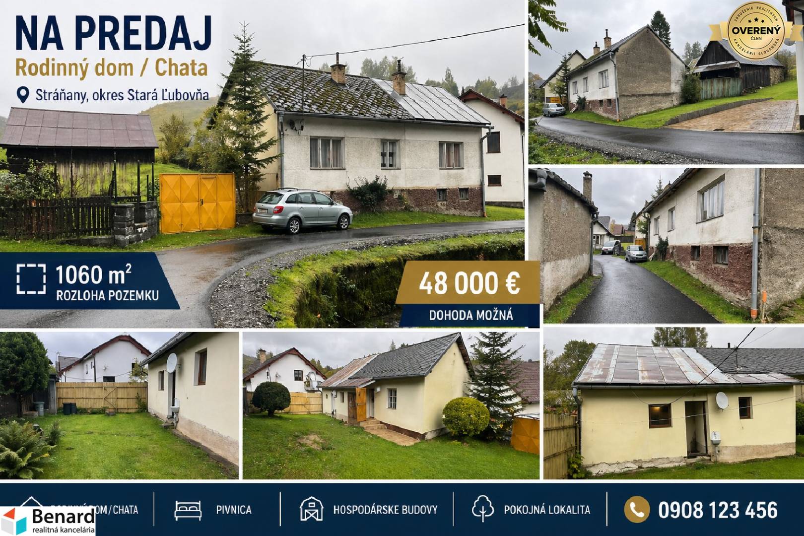 Na predaj starší rodinný dom / chalupa pri Pieninách – obec Stráňany, okres Stará Ľubovňa Ponúkame na predaj starší rodinný dom v pokojnej obci Stráňany, situovaný v krásnom prostredí neďaleko Pieninského národného parku. Nehnuteľnosť je ideálna na rekreačné využitie ako chata, chalupa alebo na víkendové bývanie, no po úpravách môže slúžiť aj na trvalé bývanie. Dom sa nachádza na pozemku s výmerou 1060 m² a ponúka praktické dispozičné riešenie: 2 spálne kuchyňa kúpeľňa Súčasťou nehnuteľnosti sú aj hospodárske budovy a dom je podpivničený, čo poskytuje dostatok úložného priestoru alebo možnosti ďalšieho využitia. Technické informácie: strecha: eternitová krytina základy: kamenné podlažie: časť z nepálenej tehly prístavba: z pálenej tehly elektrina: áno voda: vlastná studňa odpad: vlastná ČOV na pozemku Veľkou výhodou je tiché prostredie, príroda na dosah a blízkosť turistických a rekreačných možností v oblasti Pienin. Ak hľadáte miesto na oddych, chalupu v prírode alebo investičnú nehnuteľnosť s potenciálom, táto ponuka stojí za pozornosť. K domu je vypracovaný znalecký posudok z roku 2026. Cena: 48 000 € Pre viac informácií alebo dohodnutie obhliadky nás kontaktujte na: ? 0907 211 103