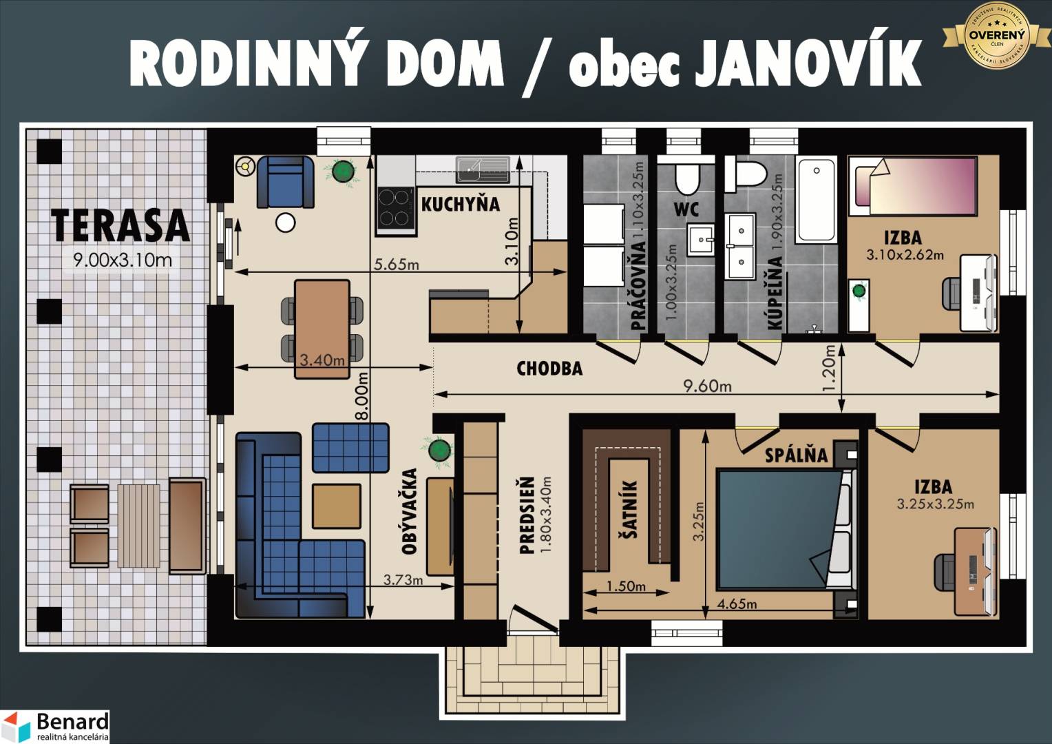 Dom disponuje týmito miestnosťami: vstupná chodba, obývačka prepojená s kuchyňou a jedálňou, spálňa s vlastným šatníkom, dve samostatné izby, kúpeľňa s toaletou, samostatná toaleta a technická miestnosť. Z dennej časti domu sa dostanete na útulnú terasu, kde si môžete vychutnávať voľné chvíle.
