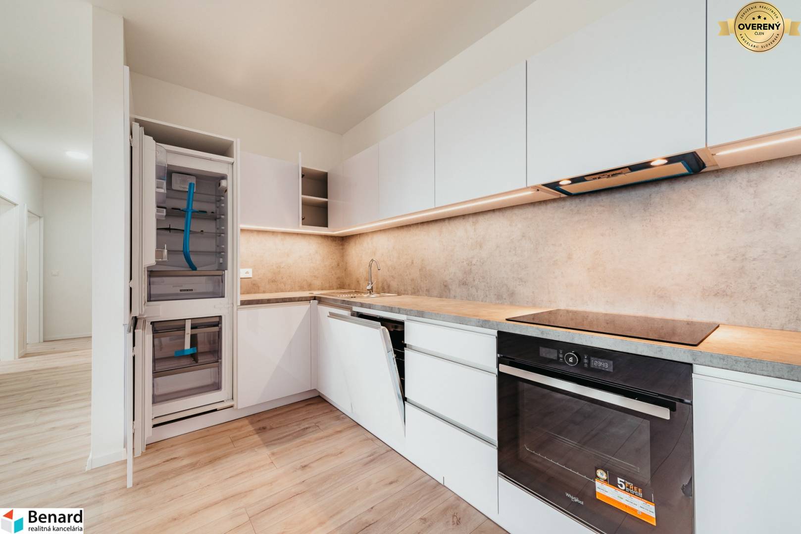 - Kuchynská linka so vstavanými spotrebičmi: chladnička s mrazničkou, teplovzdušná rúra, indukčná varná doska, umývačka riadu, digestor vedený do komína, všetko v