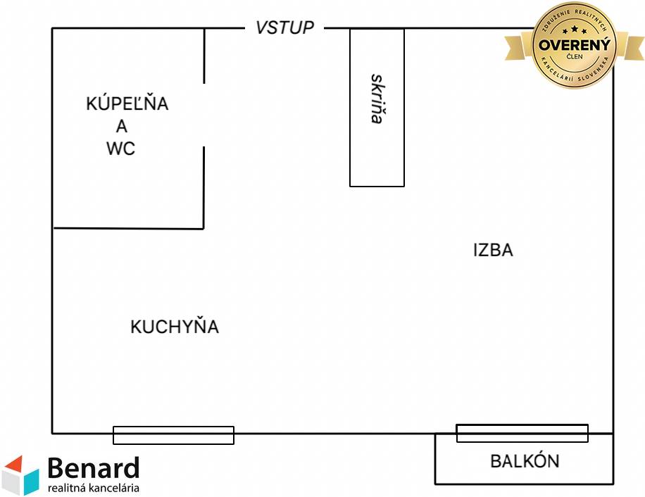 Ponúkame na predaj garsónku s menším francúzskym balkónom v širšom centre mesta Prešov - ul. Budovateľská. Bytový dom bol zrenovovaný z pôvodnej tehlovej budovy, byty (vrátane nadstavby) v ňom boli dokončené, skolaudované a dané do užívania v roku 2009. Má vlastnú kotolňu, je vhodný aj ako investícia s následným prenájmom. Uprednostňujeme platbu v hotovosti.. Pozostáva z chodby, kuchyne spojenej s izbou s výstupom na malý francúzsky balkón a spoločnej kúpeľne a WC. ZÁKLADNÉ ÚDAJE O BYTE: - celková výmera 24 m2 (+ balkón), 4/5 poschodie (bez výťahu), orientácia západ - tehlový bytový dom - osobné vlastníctvo, financovanie hypotékou možné (pomôžeme vám s jej vybavením) - kuchynská linka (r. 2009), indukčná varná doska (byt nemá plynovú prípojku) - plávajúca podlaha (izba, kuchyňa), keramická dlažba (kúpeľňa) - spoločná kúpeľňa a WC (sprchový kút) - plastové okno v kuchyni a na balkóne (2009) - nový radiátor - menší francúzsky balkón z izby (do dvora) - bez výťahu - okná mimo hlavnej cesty do dvora - pivnica - vlastná kotolňa v bytovom dome - náklady 110 eur/1 osoba + energie - parkovanie vo dvore, k dispozícii jedno parkovacie miesto Bytový dom nemá výťah! Nachádza sa v širšom centre mesta, blízko je zastávka MHD, potraviny, do centra mesta je cca 15 minút, s tým súvisí kompletná občianska vybavenosť. Uprednostňujeme platbu hotovosťou, v prípade rýchleho jednania je zľava z ceny možná. Ak máte záujem o obhliadku prípadne potrebujete viac informácii nájdete nás v realitnom centre na Slovenskej ul. č. 8 v Prešove, prípadne na kocisova@benard.sk alebo na telefónnom čísle 0910 900 920 ZADARMO K TEJTO NEHNUTEĽNOSTI DOSTANETE: - inzerovanie nehnuteľnosti na najsledovanejších realitných portáloch a v miestnych novinách; - preverenie právneho stavu a tiarch danej nehnuteľnosti; - vysvetlenie problémov záložných tiarch, vecných bremien a pod.; - právny servis zabezpečený právnikom s dlhoročnými skúsenosťami; - kópiu LV prípadne katastrálnej mapy s kolkom na právne účely; - poplatky za overenie podpisov na zmluvách u notára; - správny poplatok za vklad vlastníckeho práva do katastra vo výške 100,-€ - realitné, daňové a právne poradenstvo; - zabezpečenie znalca na vypracovania znaleckého posudku; - vypracovanie ponúk na zabezpečenie úveru u nášho hypotekárneho odborníka, ktorý spolupracuje s viacerými bankami