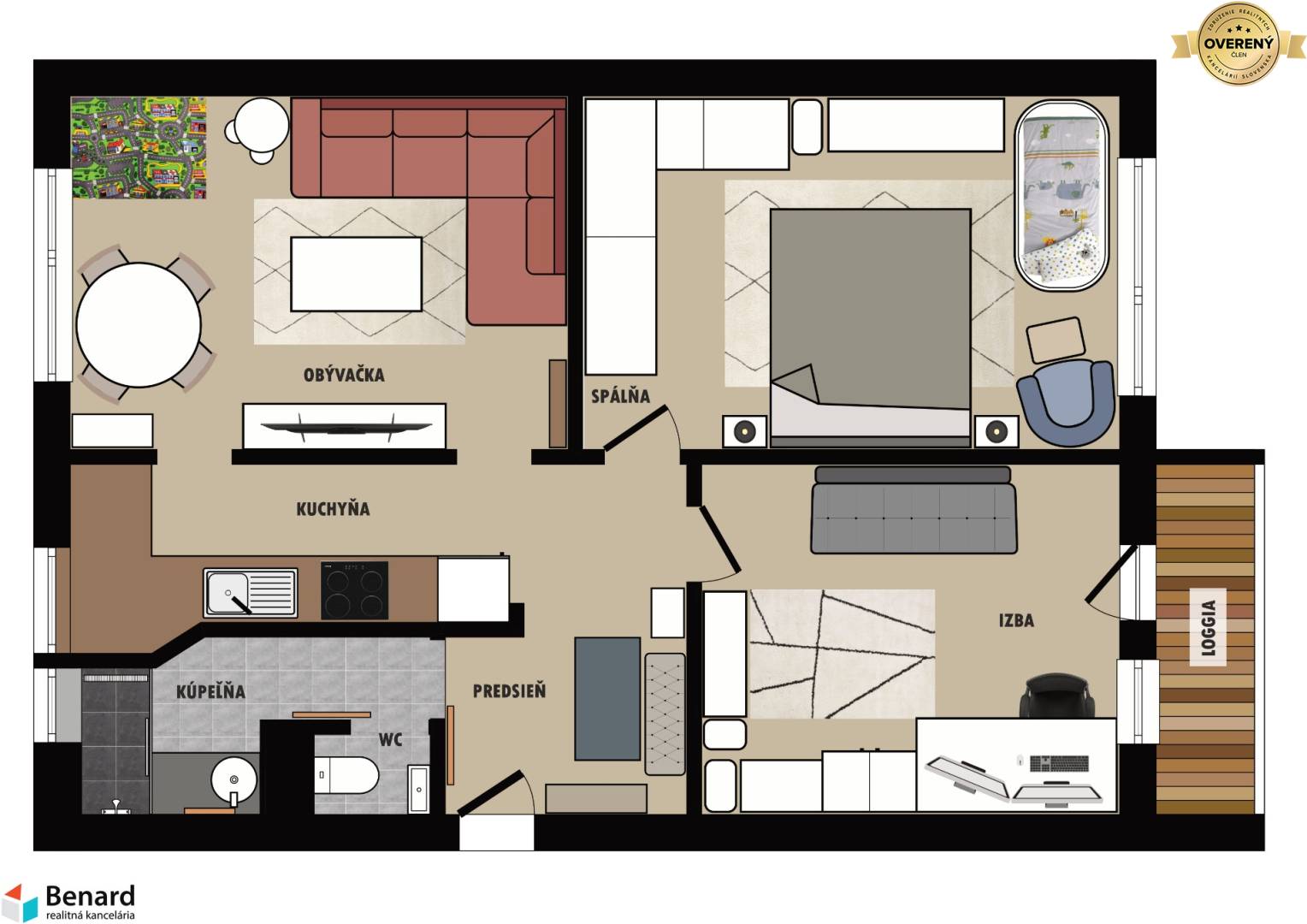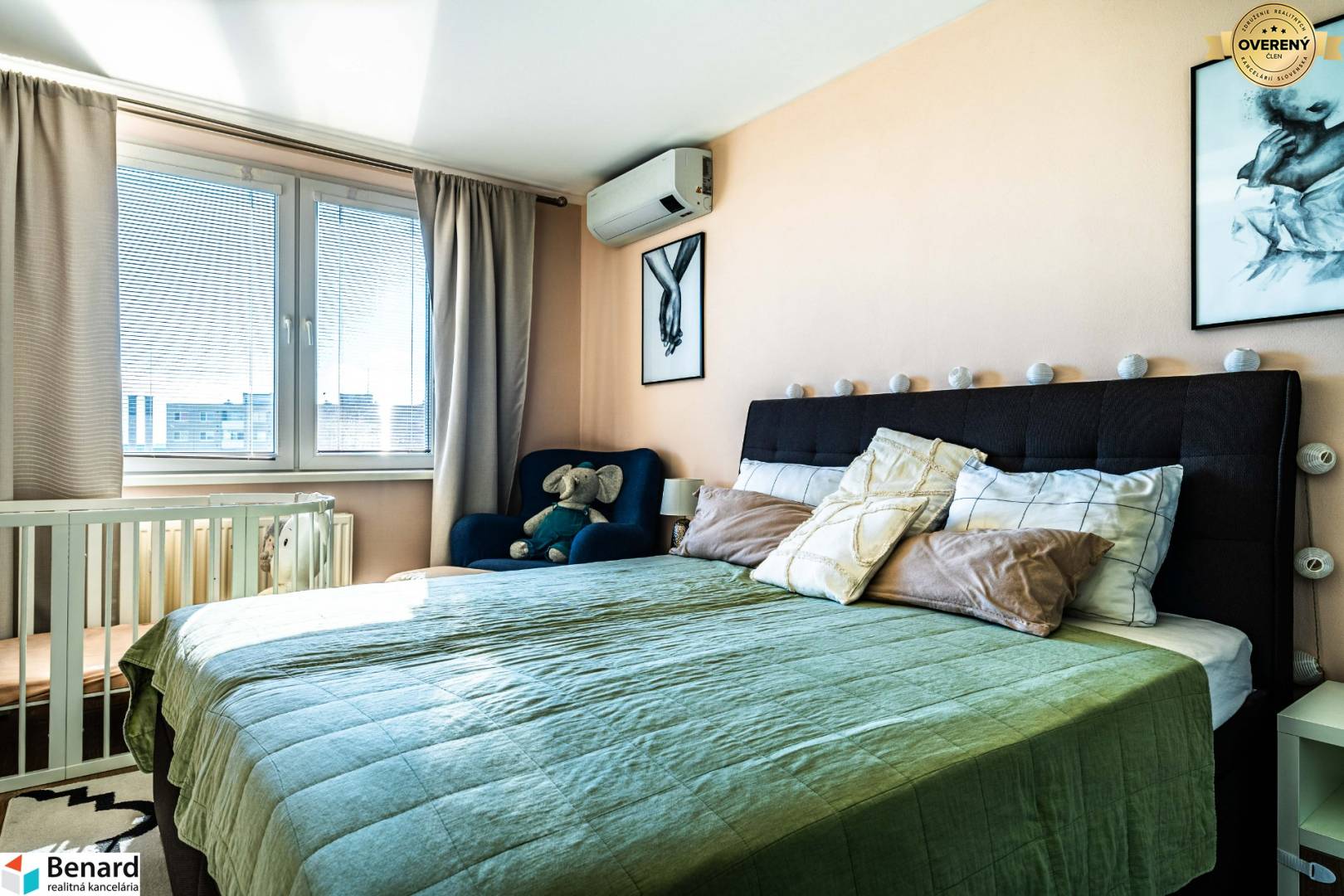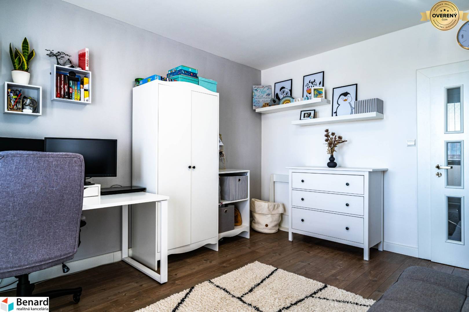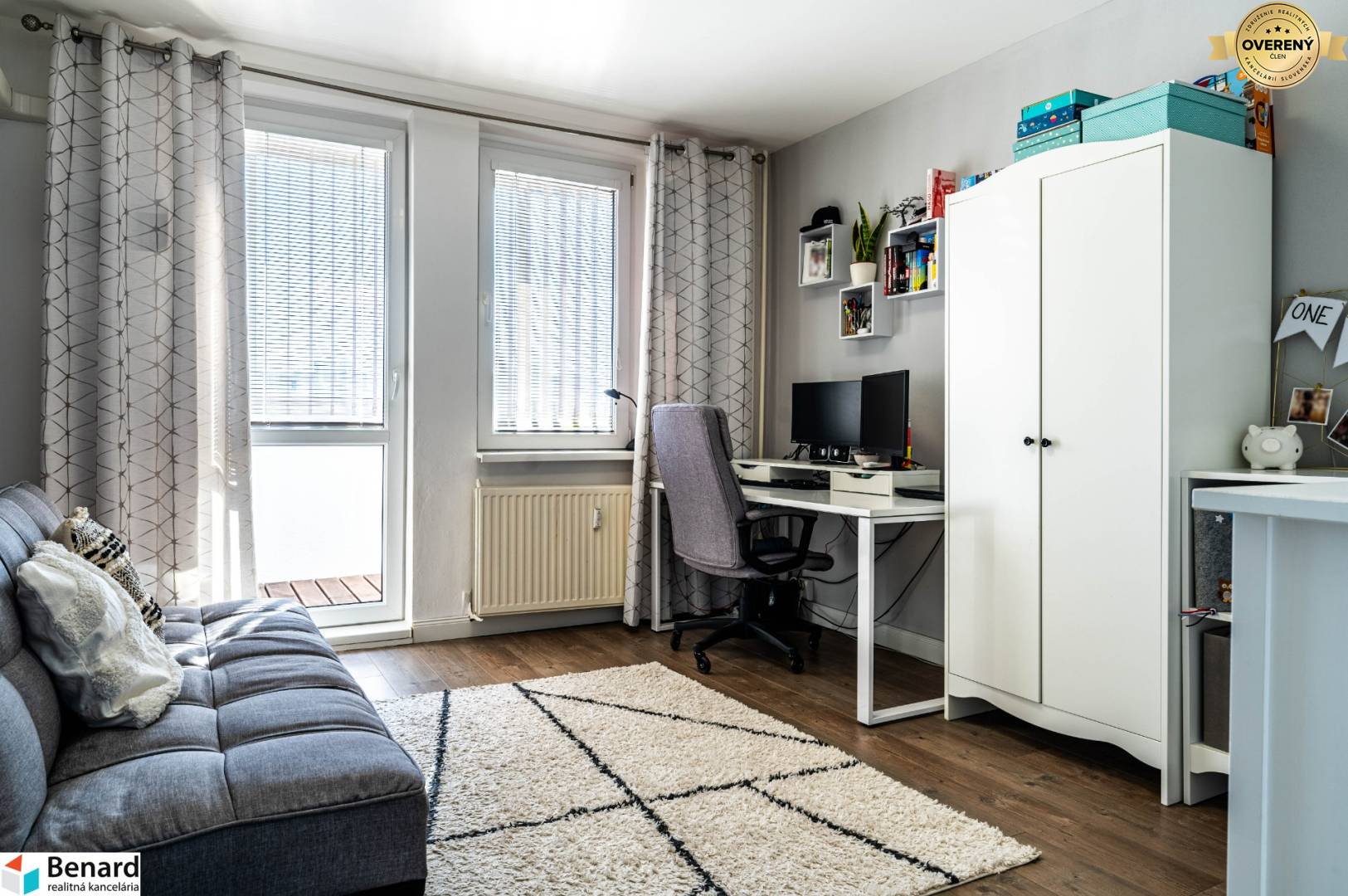 Benefitom je, že izby sú priestranné a neprechodné. Poskytujú tak dostatok úložného priestoru a súkromie. V spálni a v detskej izbe je klimatizačná jednotka. Úžitková plocha je 69m2. Vychutnať si svoj obľúbený nápoj môžete na útulnej loggii, ktorá je zasklená a má aj látkové žalúzie.